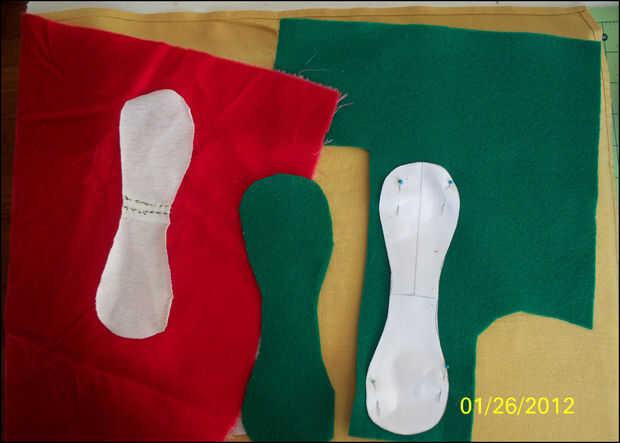 Por las fotos, pone el patrón en su paño, pin en su lugar y cortar el patrón, permitiendo que alrededor de 3/16 a 1/4 de pulgada como un margen de dobladillo.