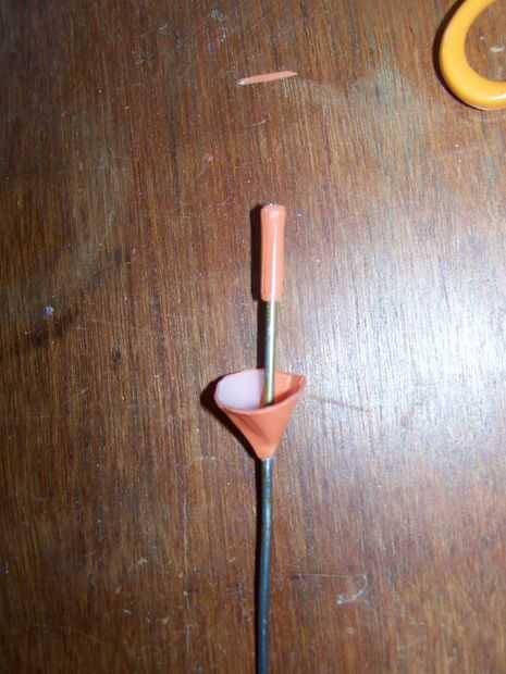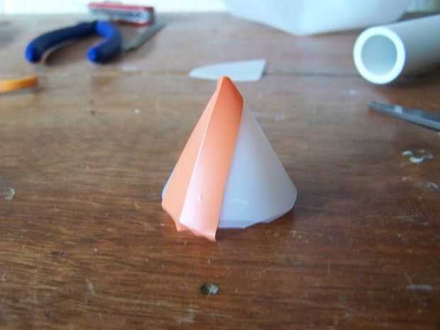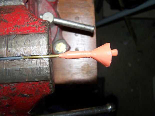 A continuación tomar la espiga y empuje hacia arriba por la parte inferior del cono hasta que el cono se coloca en el estante. Envuelva un poco de cinta aislante alrededor del área donde el cono con el eje de su dardo.