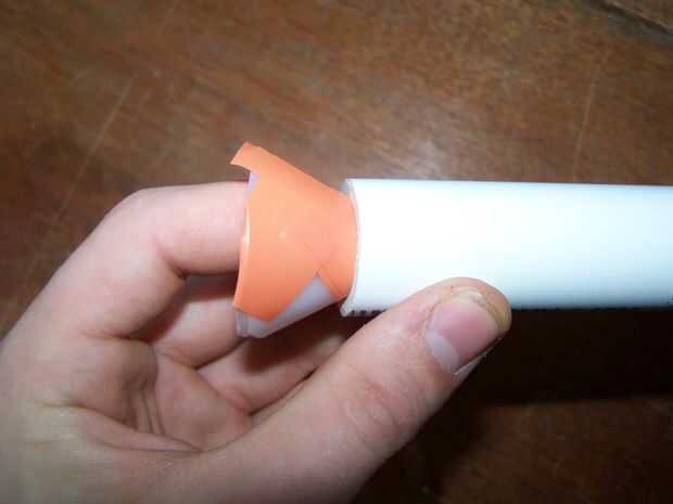 Ahora cortar aproximadamente 1/4 del círculo por lo que parece Pacman y enróllelo en forma de cono. Utilice cinta eléctrica para mantener el cono en su forma y luego Envuelva una sola capa de cinta aislante alrededor del cono... que descubriremos su difícil de conseguir sin burbujas pero es importante hacerlo lo más suave posible. Ahora sostenga el cono en el extremo del cañón y cortar poco a poco bits hasta que quede bien pero bien (no tan ajustada que necesita a la fuerza en) en el cañón.