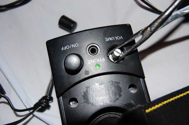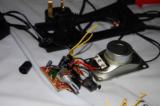 ahora necesitas quitar el tablero y los altavoces de los dos oradores. para quitar los altavoces que debe ser el altavoz en tornillos en las esquinas. para la Junta es probable que los tornillos que la sujetan en el caso, y los potenciómetros probablemente tendrá tuercas que sujetan. así que tire de la perilla de la parte delantera del control de volumen y la tuerca debe estar expuesta. Utilice alicates de punta o similares para quitarlo, a continuación, repita para otros mandos.