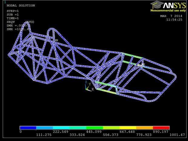 2. tu ventana ahora debe mostrar la imagen con una llave en la parte inferior que muestra la concentración de tensiones en cada parte del dibujo. Una cosa tener en cuenta es que para este ejemplo la fuerza de producción es 40 ksi así sucesivamente la tecla en la parte inferior si el número a la lucha extrema es superior a 40.000 psi que el modelo se producirá un error y es necesario hacer ajustes.