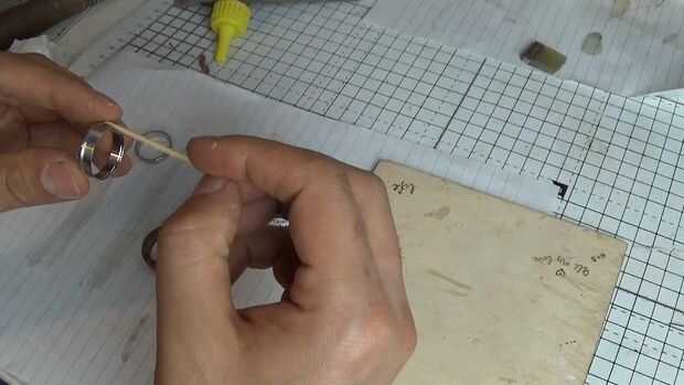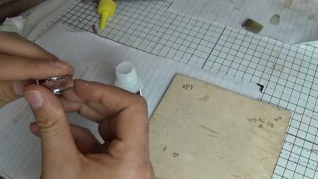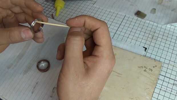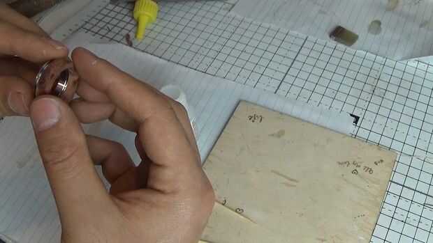 Después de algunas pruebas de montaje del anillo estaba listo para pegar encima de. Yo cuidadosamente había aplicado un pegamento de alta viscosidad a la anilla de metal en blanco, insertar una sección en un momento en la madera.