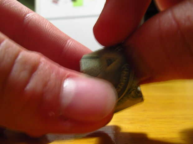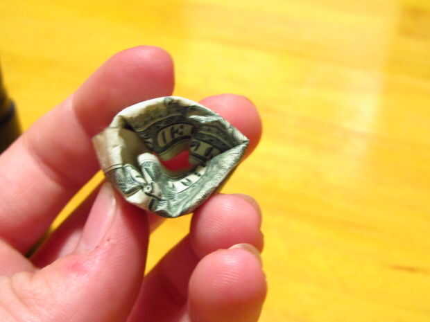 cuando empujas las aletas a través tendrás la forma de anillo básico pero tendrá puntos alrededor de los bordes y será desigual. Utilizar dedos y el pulgar para empujar y tirar el dólar en una forma más uniforme, incluso el ancho y realización de los puntos poco que naturalmente hace que el papel