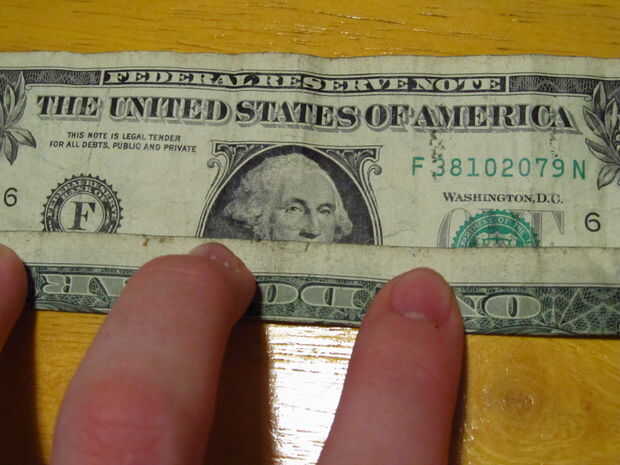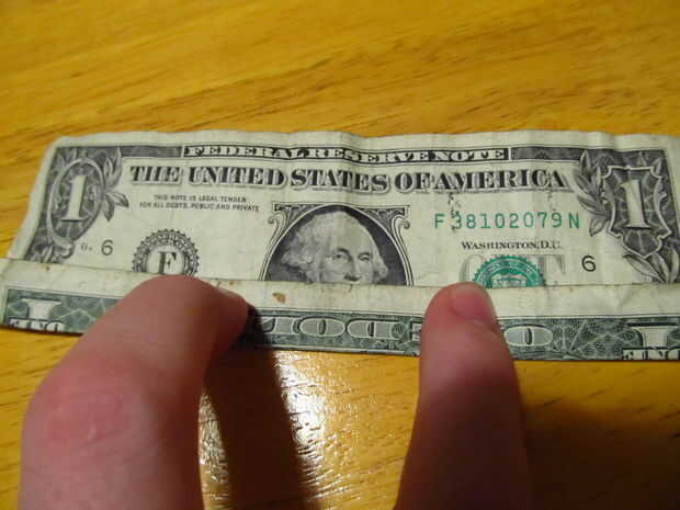 El proyecto de ley para Retrato de George está boca arriba, start en la parte inferior y hacer un doblez a lo largo justo por encima de su labio superior, el punto dulce es su área de bigote entre su labio superior y nariz. El pliegue aquí determinará el posicionamiento del producto terminado, pero vamos a llegar más en eso más tarde = P