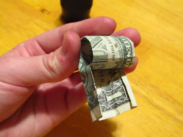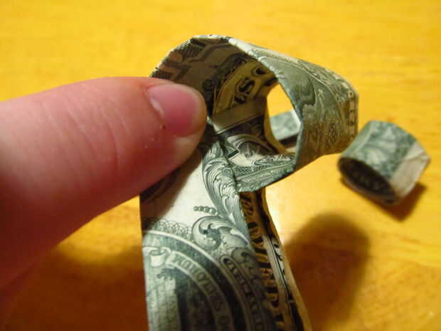 Deslice el rodillo de su dedo. En este punto que usted debe tener un poco de lazo junto con su pulgar y dedo índice, tapa que el anillo sobre el bucle es superior y la porción enrollada está por debajo, tomar la esquina de la parte interior del rodillo y Remétala bajo los pliegues hechos en los pasos dos y tres, seguir rodando y metiendo debajo de la aleta hasta que tenga un anillo sólido , se cerrará uno de los extremos y el otro abierto.