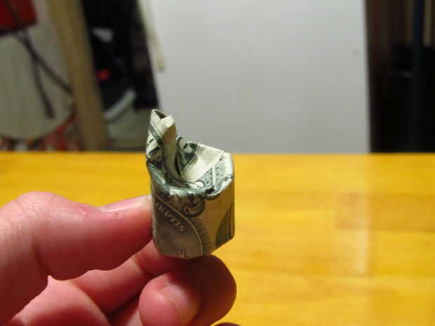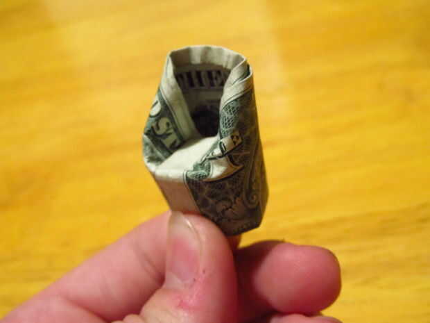 Ahora debe tener un anillo de aproximadamente 1" de altura con un final cerrado, escondido y un final abierto, no escondido. Encontrar inicia el anillo (el borde de la factura) y empezar a doblar el lado no-remetido en el centro del anillo, usted conseguirá un "punto final" a plegarse y en este punto sólo impulsará, junto con el resto, en el anillo. no te preocupes doblarlo en demasiado profundo porque los pliegues que formuló proporcionará resistencia natural, usted sabrá cuándo parar.