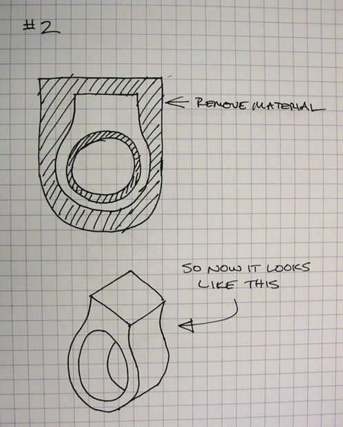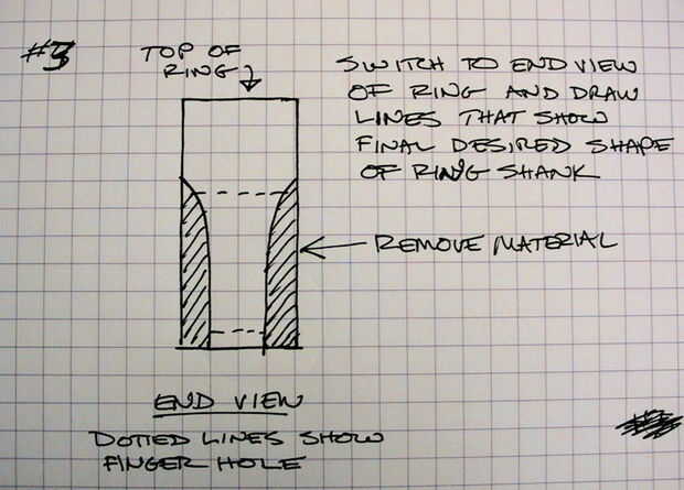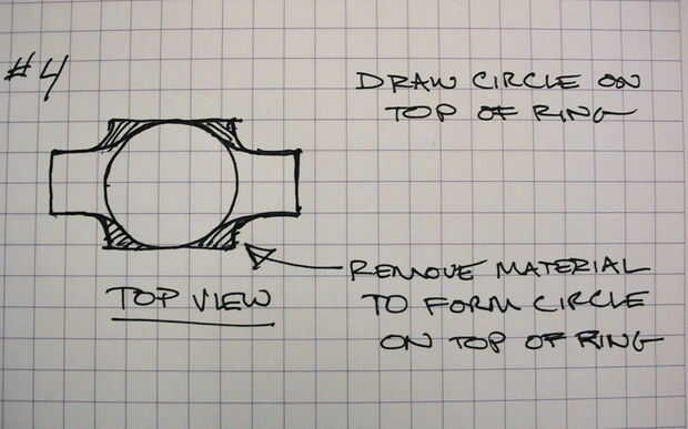 3) ahora gire la cera por lo que busca en el extremo del anillo. Ahora dibuje la forma del anillo en la cera y retirar el exceso de material. En este momento sólo está tratando de establecer la forma general del anillo y el grosor de la caña del anillo.