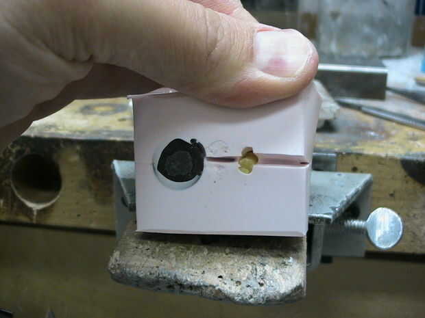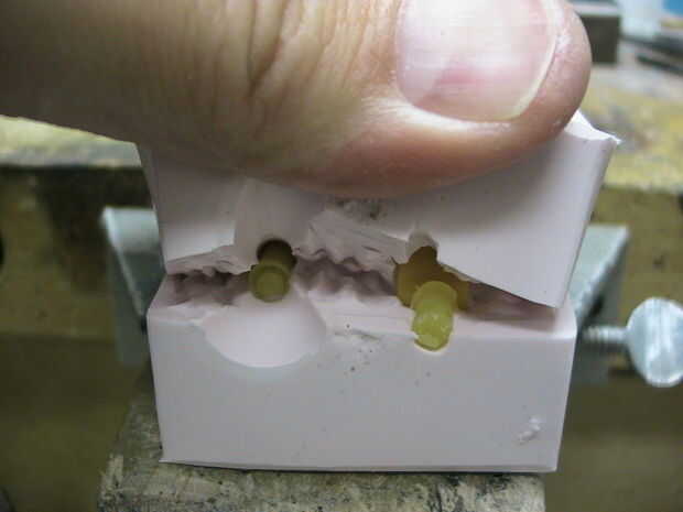 Si junto el modelo de cera al igual la mina te encontrarás que tienes que cortar ranuras como vas para que la caña del anillo será capaz de liberarse del molde. El caucho del molde es flexible un montón y el anillo se tire de derecha. Enclavijado la cera el anillo espaciador lateral hará que corte el molde abierto mucho más fácil.