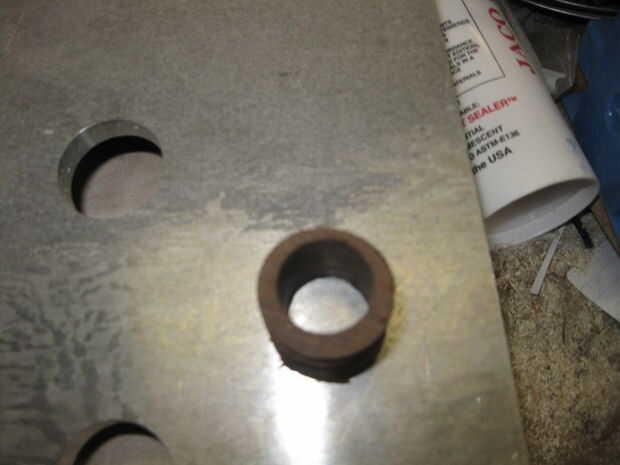 Puesto la sierra detrás de y acabado de perforar el orificio externo. Tire de la pieza en forma de anillo de madera de la sierra.
