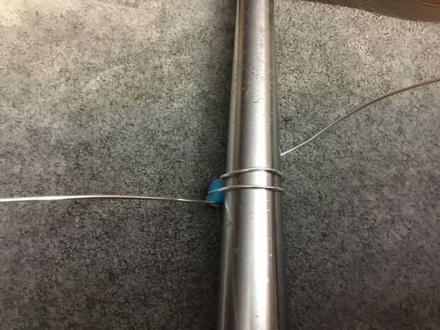Envuelva el cable alrededor del mandril anillo en direcciones opuestas en un tamaño más pequeño que lo que quieres hacer, así que para un tamaño de 7, abrigo alrededor de la talla 6. Asegúrese que los cables no se cruzan y son paralelos.