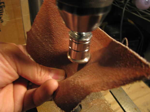 Con el conjunto de giro en el taladro, utilizar progresivamente finner arena papel para hacer el anillo es la forma final. Empiezo con grano 80, luego 400, luego de 2000. El libro de arena de grano 400 y 2000 de aerosol con agua. Esto evita que el papel de la arena se obstruya con partículas de metal. Una vez más, esto pone caliente! Y no respirar el polvo de metal.