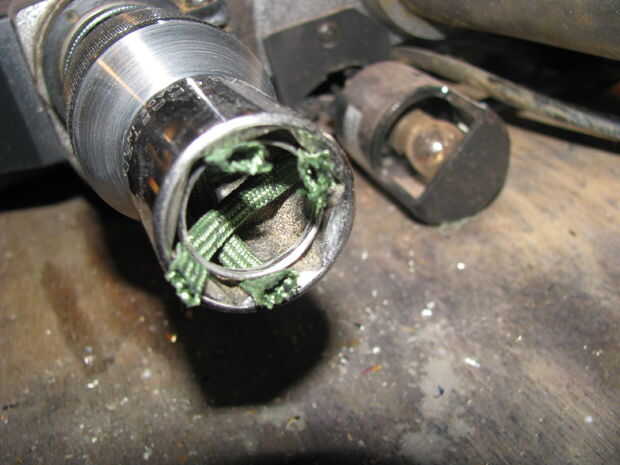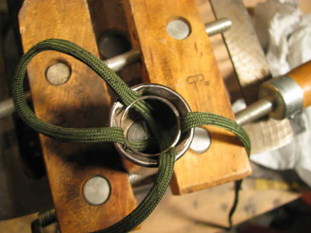 a la parte interior del anillo lo coloque dentro de un zócalo más grande. Si no cabe utilizar un "relleno" a la cuña en allí. Parachord funciona bien porque levanta al calor. Cinta eléctrica trabaja demasiado pero si calienta demasiado liquida el adhesivo haciendo que el anillo se caiga. Además de adhesivo hace un lío en el anillo.