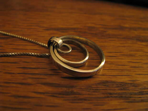 Pueden hacerse varios anillos de diverso tamaño; grueso o fino.  He hecho este colgante de 3 monedas.