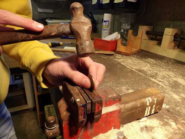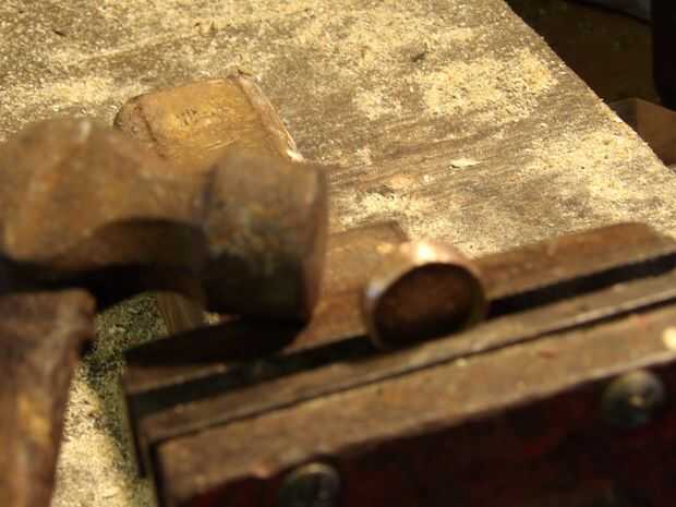 Ahora viene la parte larga y tediosa. Encontrar una buena superficie dura el empuje mientras están golpeando la moneda. Gire lentamente la moneda mientras bang los bordes con un martillo. Después de aproximadamente una hora de golpes yo tengo la mía a su tamaño pero recuerde medir la moneda como vas.