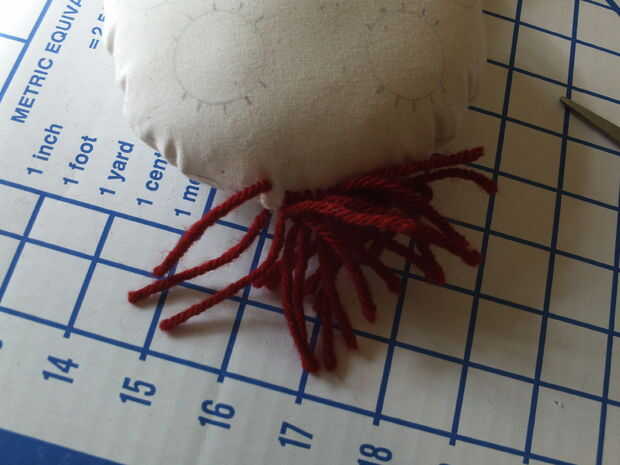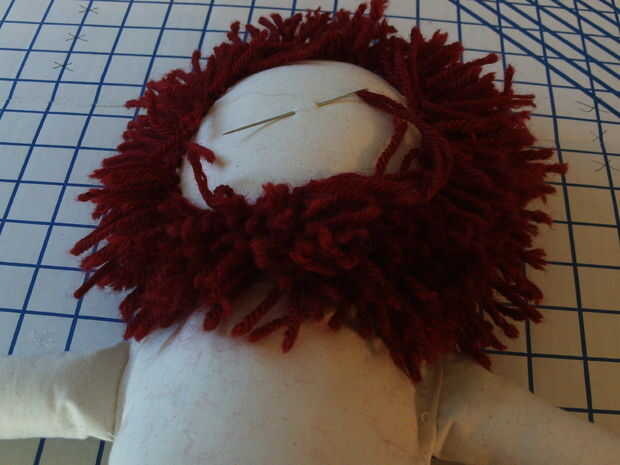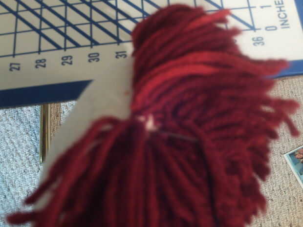 Hice el pelo de la muñeca gruesa, pero usted realmente no necesita. Trabajar su camino en un círculo alrededor de la parte posterior de su cabeza hasta que se llene. Una vez terminado, el hilo de gamuza y tire a través de algunos aspectos destacados.
