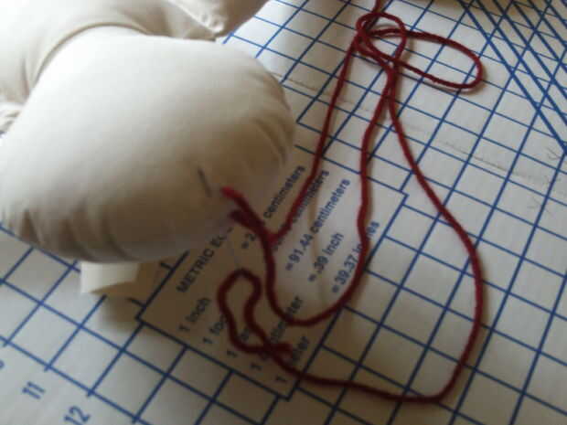 Tire el hilo casi hasta el final, dejando aproximadamente 2,5 pulgadas de longitud o más. Cortar el hilo y atar en un nudo.