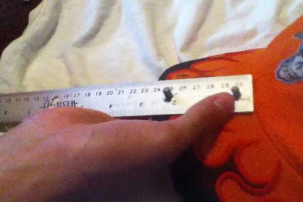 Una vez que los agujeros son perforado toma su sombrero y hacen 2 agujeros la misma distancia aparte como gobernante Fije la regla demasiado su sombrero y perno a través del sombrero y la regla ahora Atornille la tuerca para asegurarlos