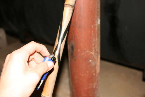 - Usé un mechero para calentar la cinta, y esto mejora la adherencia entre la cinta y el bambú. Sólo tiene un poco mejor, pero es tan fácil de pelar.