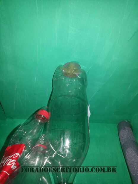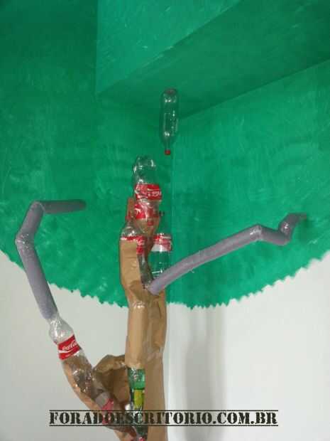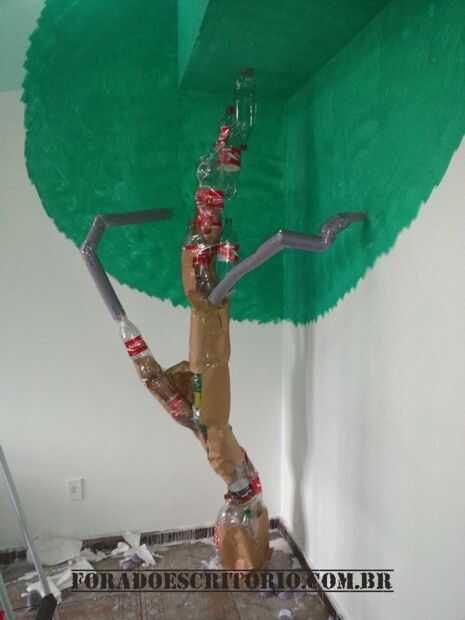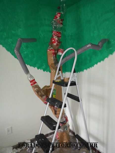 Cuando llegué más cerca al techo, me di cuenta de que el pegamento de contacto no se pegaría a la botella del animal doméstico, ya que es totalmente liso. Rayar con un cuchillo de corte, aplicado el pegamento, pegar un trozo de los tallarines de la piscina y me aplica el pegamento para pegar a la pared. También fue hecho esta manera pegar el árbol al suelo.