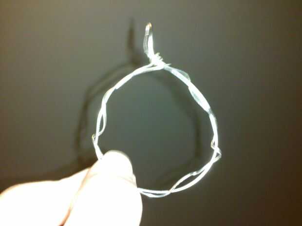 A continuación, tomar el resto del hilo y enróllelo alrededor de y alrededor de la estructura original. Cómo bien arrollar el hilo depende de usted. Una vez en el bucle de la botonera, enrolle el cable alrededor del lazo, un par de veces. No tienes que enrollar el cable alrededor del círculo original si usted no desea, pero creo que añade carácter al pendiente. Si no haces este paso, enrolle el cable alrededor de su ciclo un par de veces en lugar de sólo una vez. :)