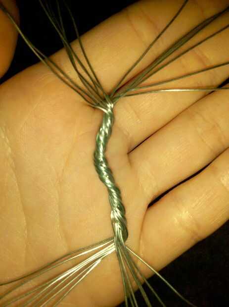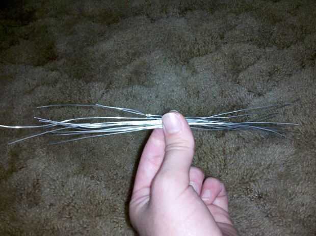 Ahora usted necesita conectar los segmentos de cable. En primer lugar, dividir los cables en dos grupos iguales. Luego, gire los dos grupos uno alrededor del otro en el centro que hay cables rectos por encima y debajo de la sección torcida. Debería verse como la segunda foto. :)