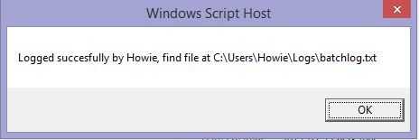 > usermessage.vbs ECHO WScript.Echo( "Logged succesfully by %UserName%" )WSCRIPT.EXE usermessage.vbs
