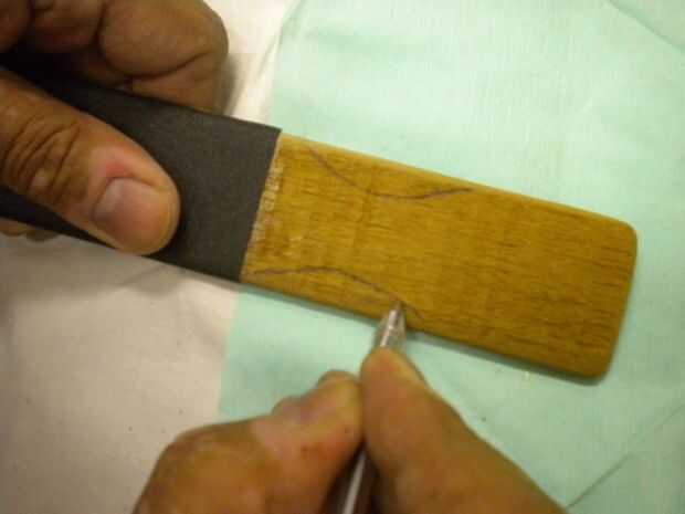 Se marca la porción desnuda del listón que se vaya a hacer el mango. Aunque hacer un mango no es un paso esencial, es uno que hace el archivo muy cómodo de usar y por lo tanto se recomienda. El mango se forma fácilmente usando un archivo de madera gruesa o escofina.