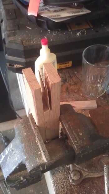 Los pedazos de mango con muescas para el grosor adecuado y pegados a ambos lados del trozo de madera.