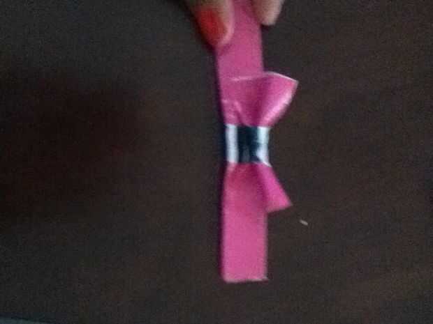 se necesita:Su color favorito de cintaHorquillaReglaTijeras o un cuchillo del ExactoPaso 1: Paso 1Cortar un pedazo de 18.5 pulgadas de cinta.Paso 2: Paso 2 Doblar la pieza por la mitad pero deja un pequeño pedazo de lado pegajoso todavía libre. Luego