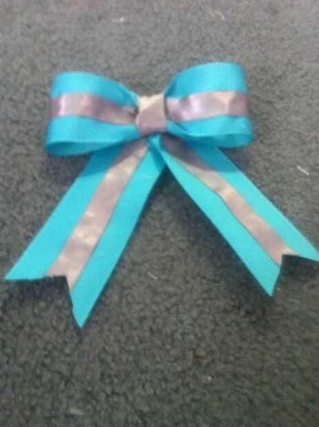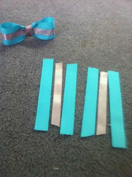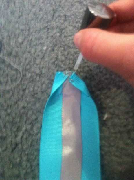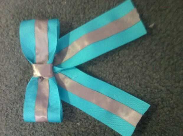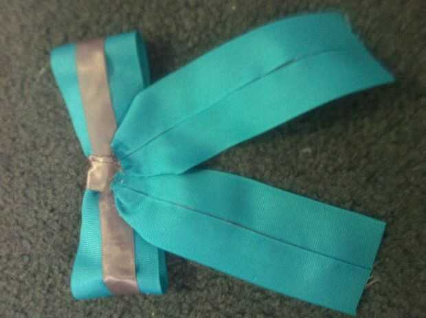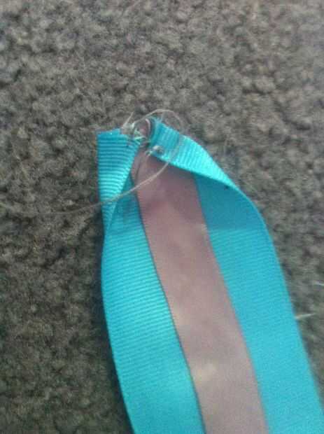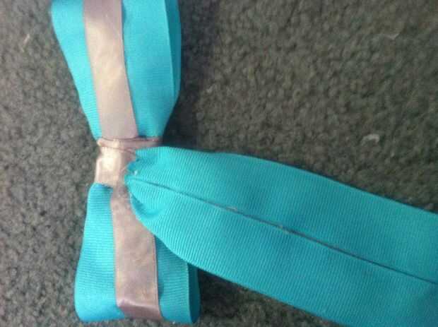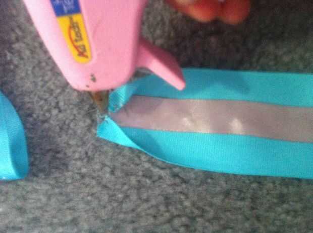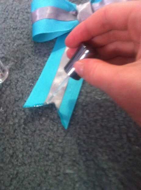 Repita el paso 2 para hacer las colas pero no doble los mitad cuando cosa les. Poner pegamento caliente a lo largo de la parte delantera del borde cosido y conectar a la parte posterior del arco. Colóquelo en un ángulo hacia fuera y ligeramente al lado. Hacer lo mismo con la otra pieza. A continuación cortar una forma de V en los extremos de cada cola. Pintar los extremos de las colas con esmalte de uñas claro.