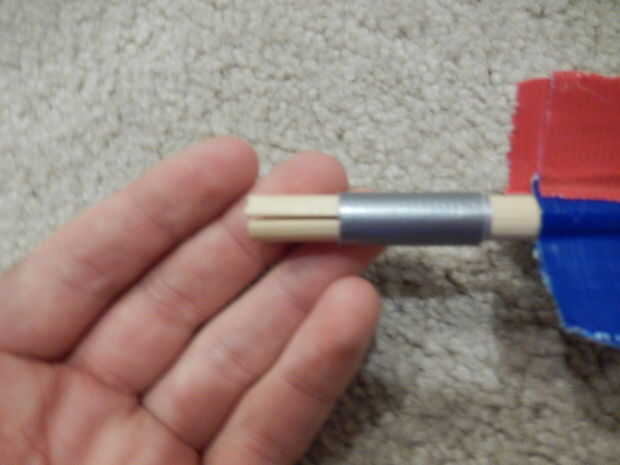 Para la primera parte de la flecha, tienes que hacer el eje. He hecho de una clavija de madera vieja que tenía por ahí solo y nunca iba a conseguir utilizado para nada. En primer lugar, tomó una sierra para clavijas de corte y corte de la flecha a su tamaño. A continuación, tomé esa sierra y corte directamente abajo del eje y finalmente dividir el eje en medio del extremo cerca de 1 pulgada hacia abajo. Luego graba directamente alrededor de la clavija para evitar de partir demasiado abajo del eje. Por último, utilicé el orificio más grande en el sacapuntas (significado generalmente para lápices de colores) y afiló la clavija a un punto agradable. Para esto, se puede utilizar una flecha separada, pero he encontrado esto es mucho más fácil.