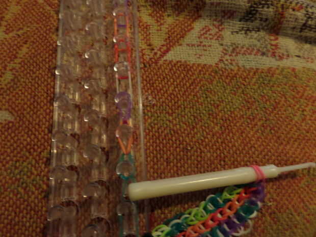 cosas que usted necesita:s-clipganchotelarbandas de gomaPaso 1: a partir Puso sus bandas en una posición de zig zag como en el cuadro hasta llegar al final. Utilicé color de rosa ya que tengo muchos.Paso 2: engancha El telar alrededor del tirón por l