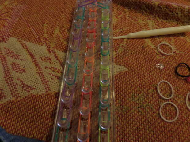 cosas que usted necesita:s-clipganchotelarbandas de gomaPaso 1: a partir Puso sus bandas en una posición de zig zag como en el cuadro hasta llegar al final. Utilicé color de rosa ya que tengo muchos.Paso 2: engancha El telar alrededor del tirón por l