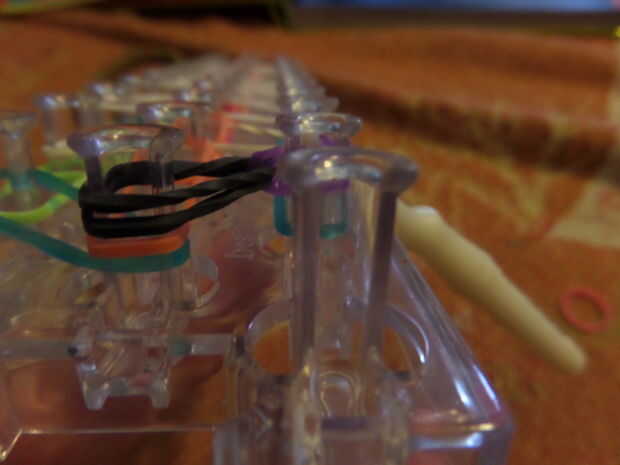 ahora voltee el telar y permite iniciar bucle. primero tire la goma negra y coge la goma superior y hacerlo de nuevo con todo y tire hacia atrás el blanco uno más tarde al llegar a él.