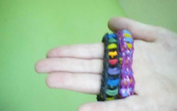 Esta es la pulsera como se verá cuando esté terminado. Yo recomiendo usar 3 colores diferentes para esta pulsera. Antes de poner las bandas en el paso siguiente Asegúrese de que doble todas las bandas, si crees que me refiero a hacer una banda de la