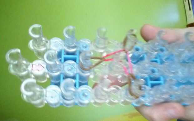 Esta es la pulsera como se verá cuando esté terminado. Yo recomiendo usar 3 colores diferentes para esta pulsera. Antes de poner las bandas en el paso siguiente Asegúrese de que doble todas las bandas, si crees que me refiero a hacer una banda de la