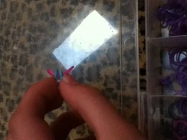Paso 1: materiales!!! Telar o los dedos o una herramienta, gancho, bandas, clipPaso 2: 1 banda Colocar una banda en una x en la herramientaPaso 3: siguiente Lugar 2 bandas más en la herramientaPaso 4: bucle! Agarrar la banda inferior y coloque encima