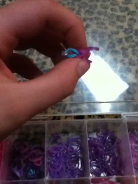 Paso 1: materiales!!! Telar o los dedos o una herramienta, gancho, bandas, clipPaso 2: 1 banda Colocar una banda en una x en la herramientaPaso 3: siguiente Lugar 2 bandas más en la herramientaPaso 4: bucle! Agarrar la banda inferior y coloque encima