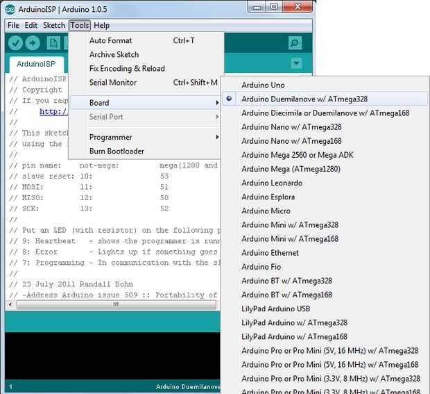 Herramientas > Junta Directiva > Arduino Duemilanove con AtMega328.