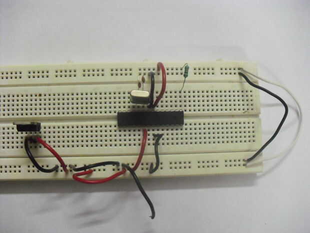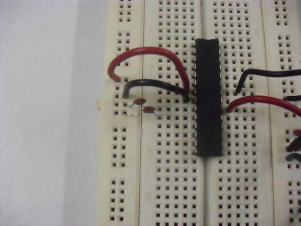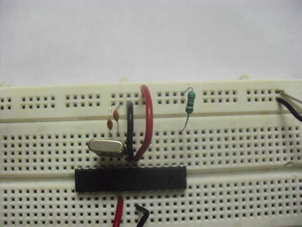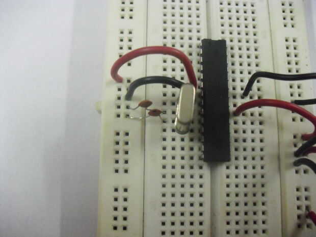 Por último agregar un cristal de 16 Mhz entre los pines 9 y 10 en el Atmega328.