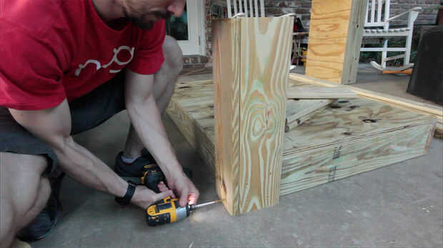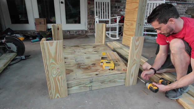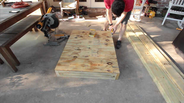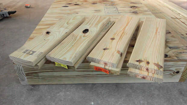 Para las piernas, cortar 8 piezas de tableros decking, 24″ cada.