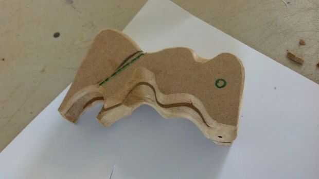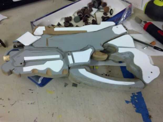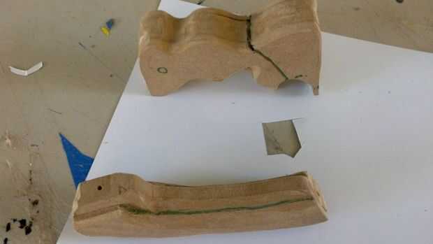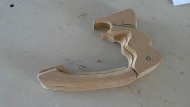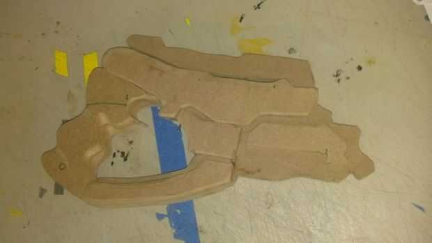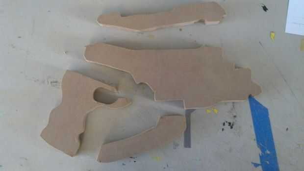 4.) corte y había trazado la capa base en tablero de MDF. Utilicé una sierra de calar para cortar las piezas. Montar el arma en piezas que encajan como un puzzle.