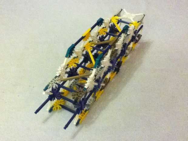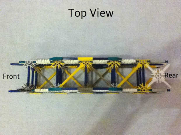Este siguiente segmento de marco esencialmente sigue un patrón similar como los segmentos anteriores. La principal diferencia es la adición de una capa extra (el uno con los conectores verdes) en la parte superior para construir altura extra en esta parte de la estructura. Para ello, reemplace algunos de los conectores amarillos (semicírculo) que serían normalmente en la parte superior con conectores blanco (círculo) en su lugar. Luego agregue la capa verde conector como se muestra. Asegúrese de mantener el patrón zig-zag de las barras del amarillo como antes.