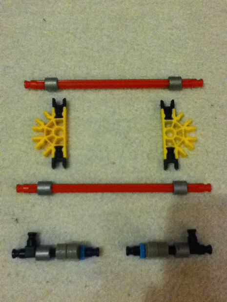 A continuación, reunir/montar las piezas como se muestra. Sujete a la parte trasera de la carcasa de transmisión en la zona del equipo amarillo. El extremo del eje con el engranaje amarillo es ahora compatible. Los conectores amarillo van en cada extremo de las barras del rojo.