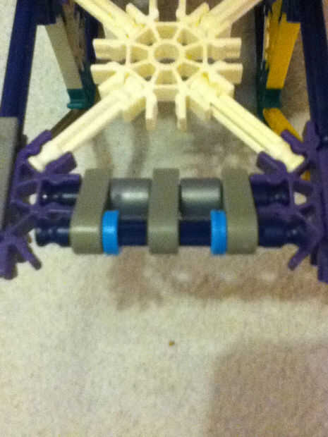 A continuación, Enrosque una barra azul a través de los tres conectores gris en el extremo posterior inferior de la carcasa de transmisión (estos conectores gris fueron agregados cerca del principio de la unidad de construcción de viviendas). También incluyen a los dos espaciadores azul como se muestra en la que la barra azul.