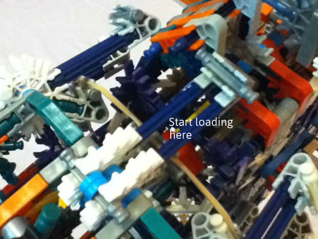 Comience con el primer barril más allá de la leva de la rampa (ver foto). Consulte el paso 10 para obtener instrucciones sobre cómo cargar las bandas de goma en el cuerpo. De cargarse este primer barril antes de proceder a la siguiente. Cargar unos 4 gomas en cada barril.