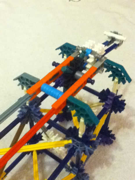Los espacios entre los conectores verdes, dispuestos en los seis octágonos a lo largo de la longitud de los corazones, aceptará los extremos libres de las barras azules de los barriles (a excepción de los ejes de radios). Coloque todos los barriles de 8 entre los conectores verdes alrededor de la base de estas barras azules. Como se muestra arriba en la segunda foto, te darás cuenta que las barras azules formando los ejes de rayo no son todavía coronadas en sus extremos. Hacerlo mediante la adición de un conector verde entre cada par adyacente de extremos de eje habló (no se muestra - tenga en cuenta que solo muestro un barril está conectado como el resto de los barriles se unen en la misma forma).