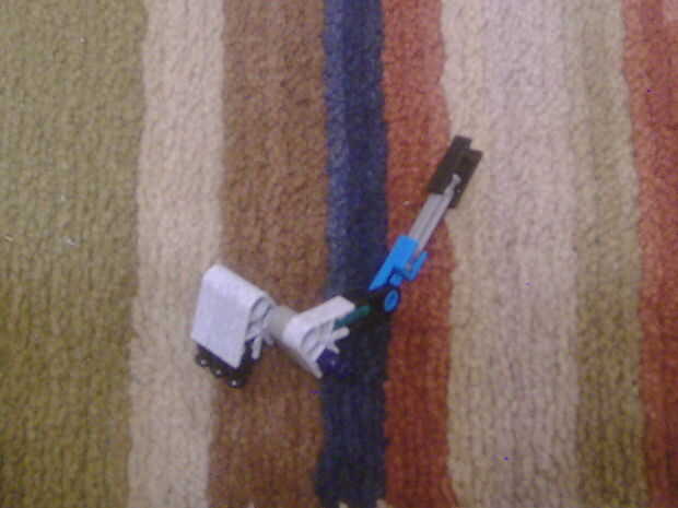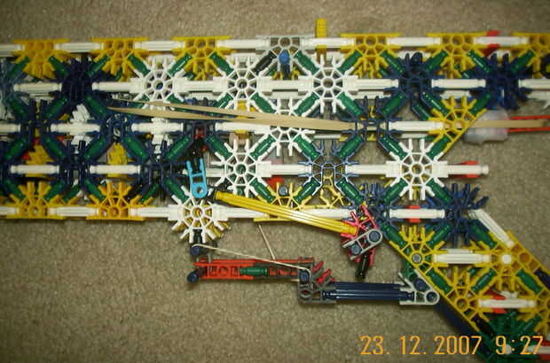 El gatillo de la pistola es una bisagra que tira un conector naranja abajo, fuera del camino del perno de la leña, así disparando la pistola. Es una forma muy sencilla para hacer un verdadero disparador y tiene casi la misma cantidad de energía como un bloque.