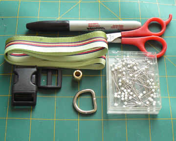 Para este proyecto se necesita; una máquina de coser, un broche plástico, anillo en D y slider, una pluma de marca, tijeras, alfileres, grano un agujero grande y tres pies de cualquier tipo de cinta que desee. El tamaño del hardware depende de la anchura de la cinta que desee utilizar. Mi cinta era 3/4" ancho, así que necesitaba 3/4" hardware.