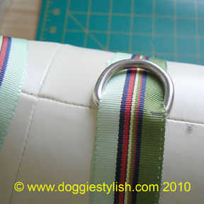Encontrar el centro de sus perros hacia atrás y coloque el anillo en D en posición. Marque la posición de la anilla con un marcador como se muestra en la segunda foto.